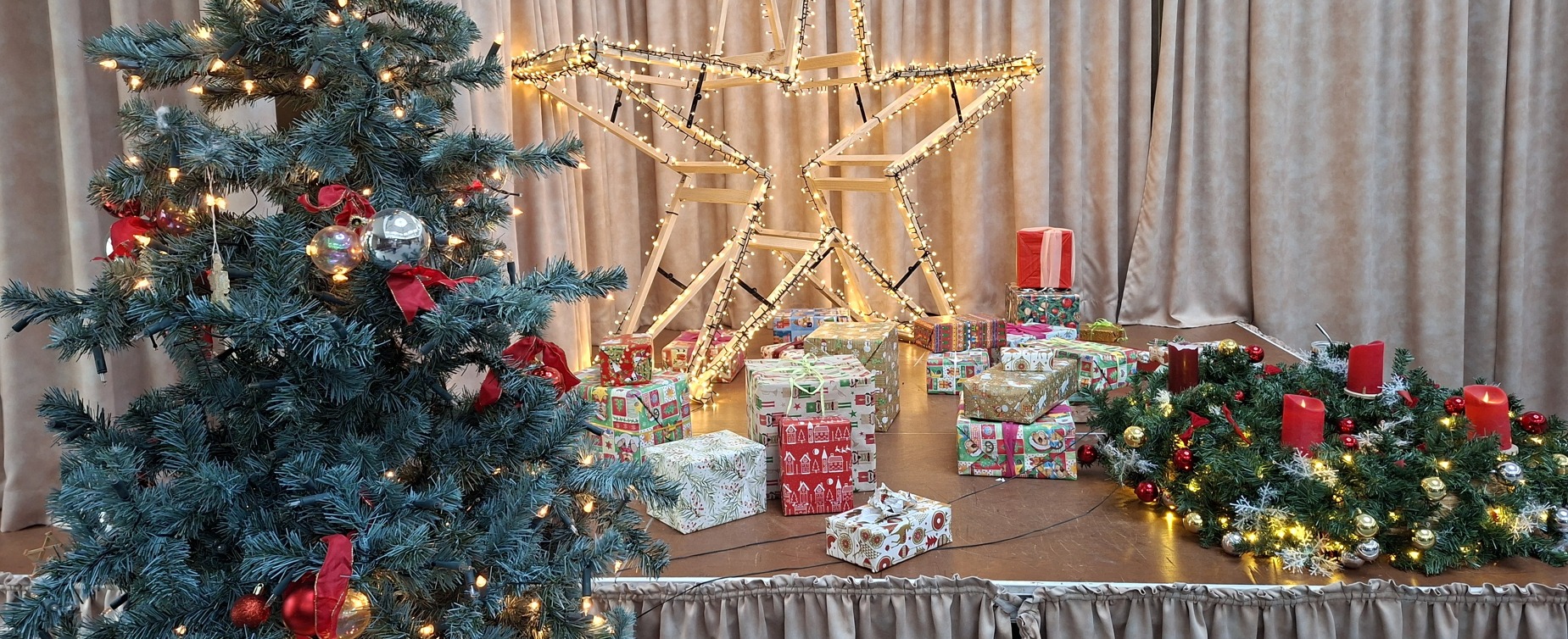 Es war so weit, am 10. Dezember 2025 um 10.00 Uhr öffneten sich dann die Türen der gut ausgeschmückten und dekorierten Aula. Frau Germer eröffnete seitens der Schulleitung die Veranstaltung. Mit mehreren raffinierten Liederrätsel und gemeinsam gesungenen Weihnachtsliedern begann der kulturelle Teil.